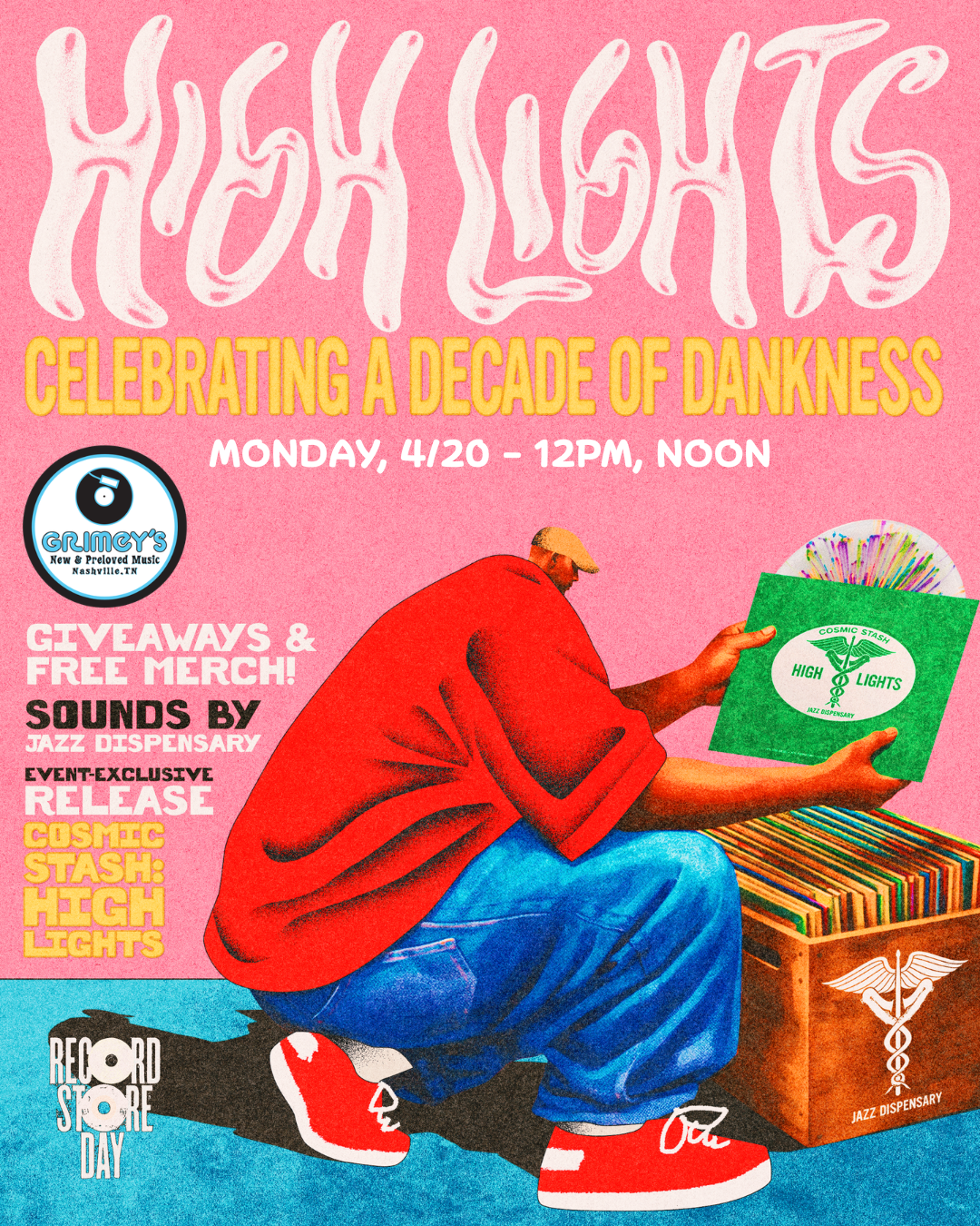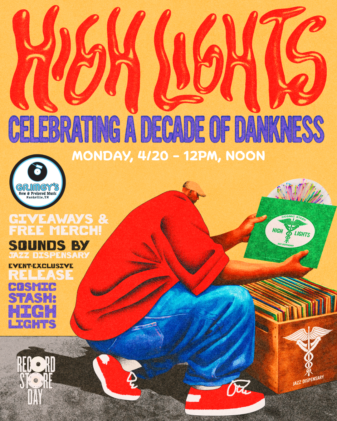 We hope you can join us in the record shop on Monday, April 20th, at noon for a special celebration of Jazz Dispensary’s 10th Anniversary! At our High Lights listening party we’ll be spinning albums from the dank Jazz Dispensary catalog, sharing party favors, and selling the copies of the new Jazz Dispensary limited edition compilation, Cosmic Stash: High Lights*, available exclusively at shops hosting anniversary celebrations. (While supplies last. Purchases limited to one, per person, in person only; no holds or special orders please.)