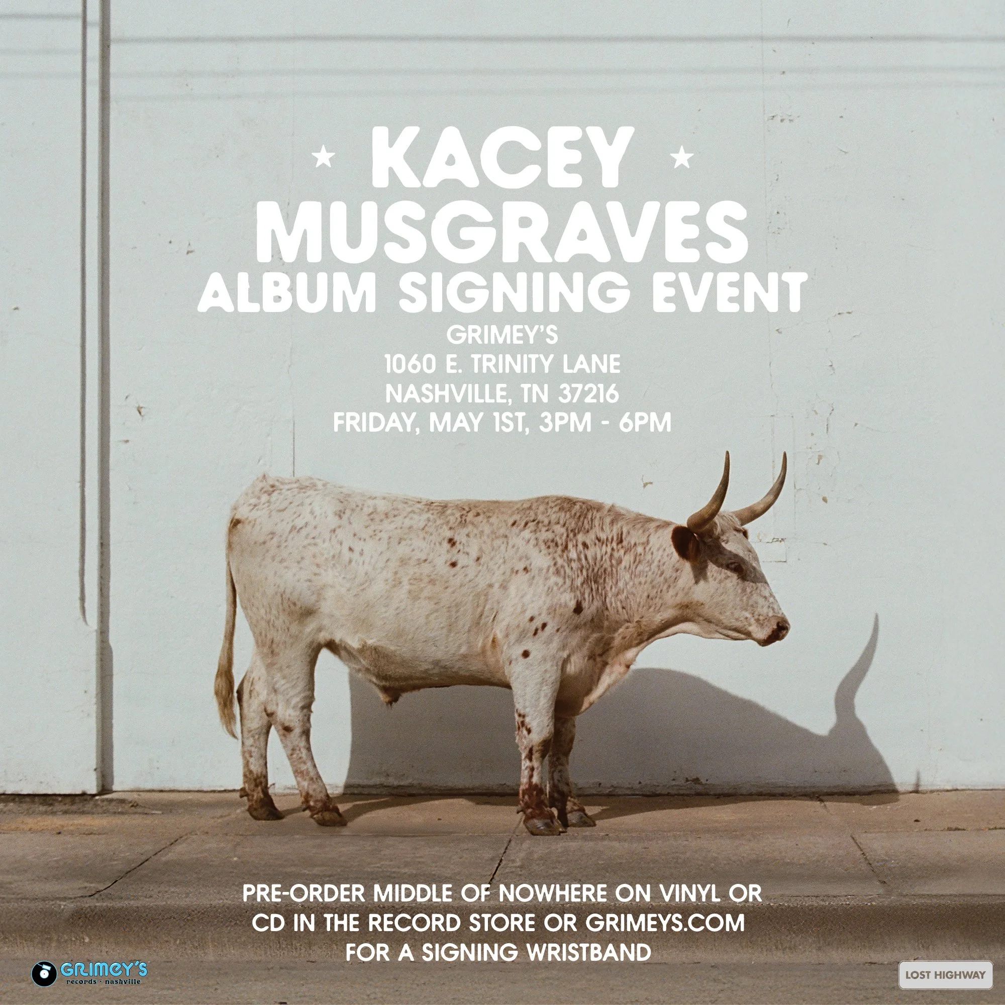Make plans to join us at Grimey’s on Friday, May 1st for a very special Kacey Musgraves Middle of Nowhere record signing! Kacey will be autographing copies of her new album for attendees who have preordered Middle of Nowhere from Grimey’s. All who preorder her new record from our site here will receive a wristband for the signing event. Wristbands are required to participate in the signing for anyone 13 and older. (*Kids 12 & under don’t need wristbands if attending with wristband-holding adults.) We anticipate this preorder opportunity to sell out, so act fast, friends!
