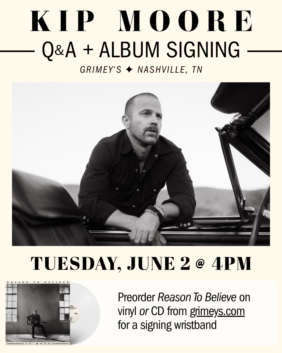 Make plans to join us in the record shop for a special Kip Moore Reason to Believe record release celebration! We’ll be welcoming Kip back to Grimey’s on Tuesday, June 2nd at 4:00 PM for a Q&A and album signing. He’ll be signing copies of his new album for attendees as well as answering questions provided by fans. All who preorder his new record from our site here will receive a wristband for our album signing. Wristbands will be distributed with preorder pickup and are required to participate in the signing for anyone 13 and older. (*Kids 12 & under don’t need wristbands if attending with wristband-holding adults.)